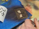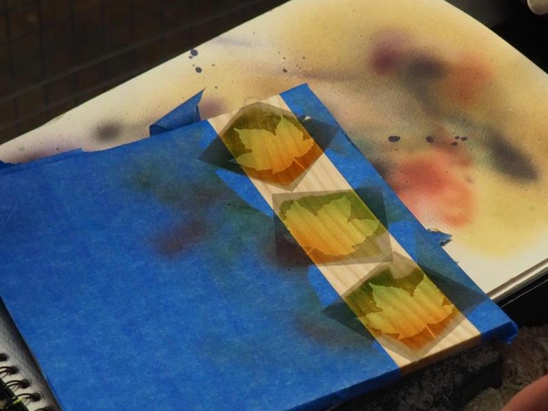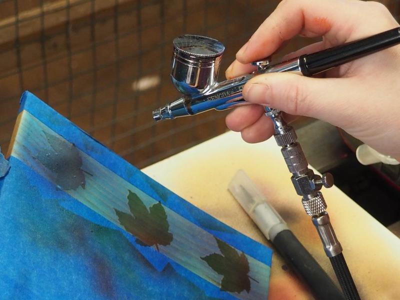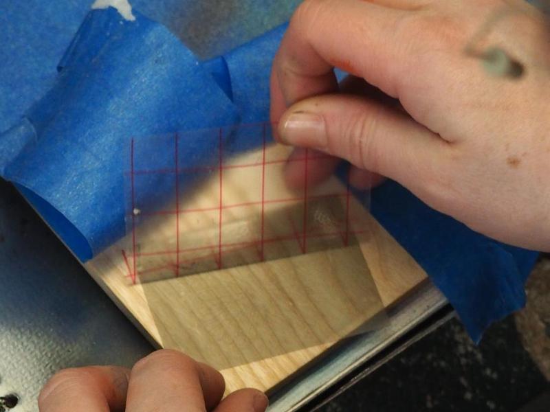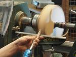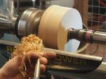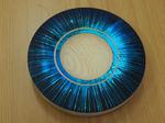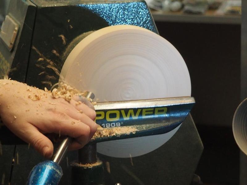 Emma Cook aka The Tiny Turner. March 2024. 4 projects completed. 1 Square platter enhanced with tranfers and paint. 2 a hand turned sphere. 3 a dish decorated using the centrifugal paint technique, and 4, a table lamp, using a globe with coloured lights inserted.
