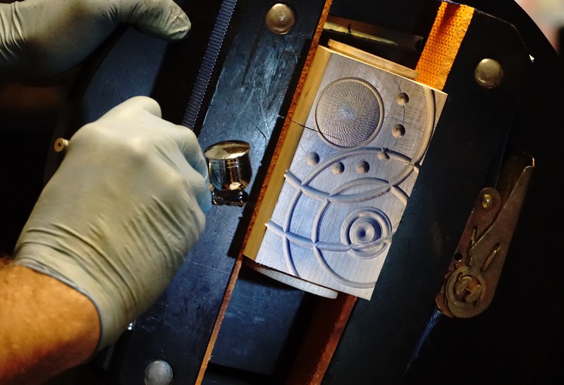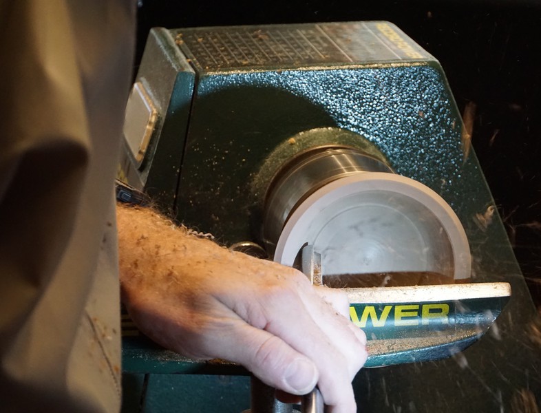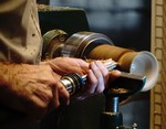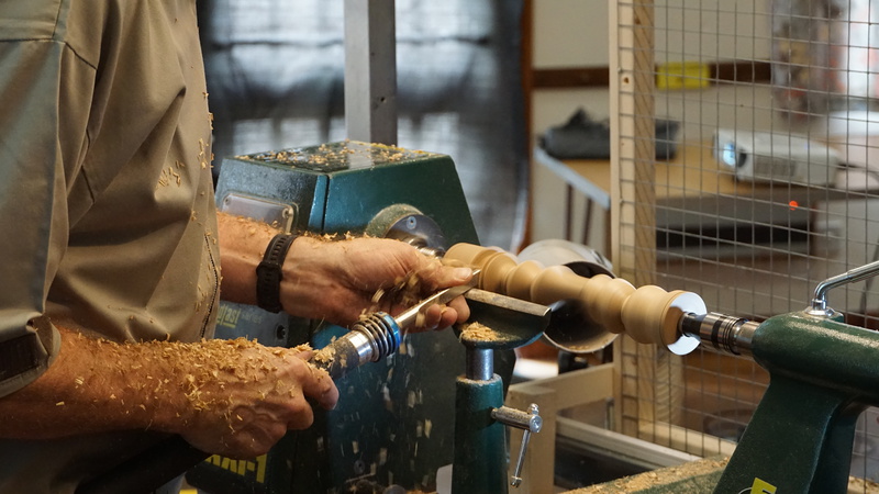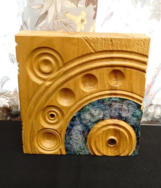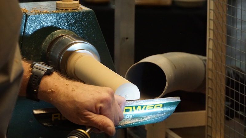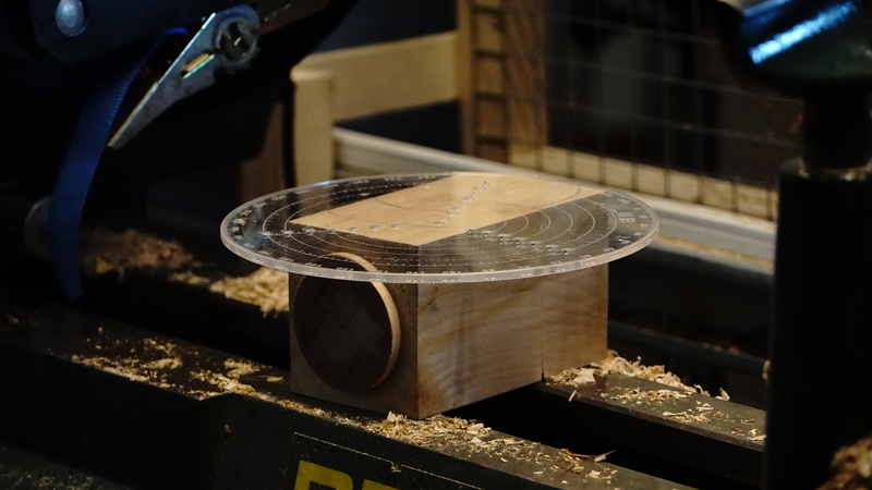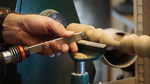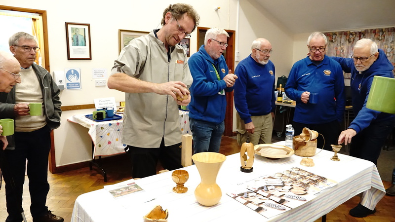 Rick Dobney. Pictures of demo projects. Firstly an off centre bowl in a bowl, followed by an multiple off centres candlestick. He then showed a special jig.